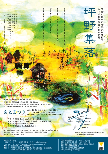 音楽家村井祐児と美術家岩間賢が出会い、築数百年の茅葺古民家を再生し坪野へ通い続けています。今春からはこの地を守る棚田とその水源であるブナ林をひらき、2011年3月12日の長野県北部沖地震で半壊した土蔵を再生しました。